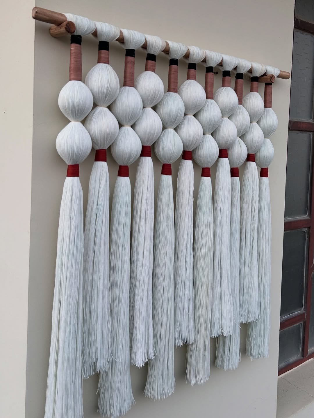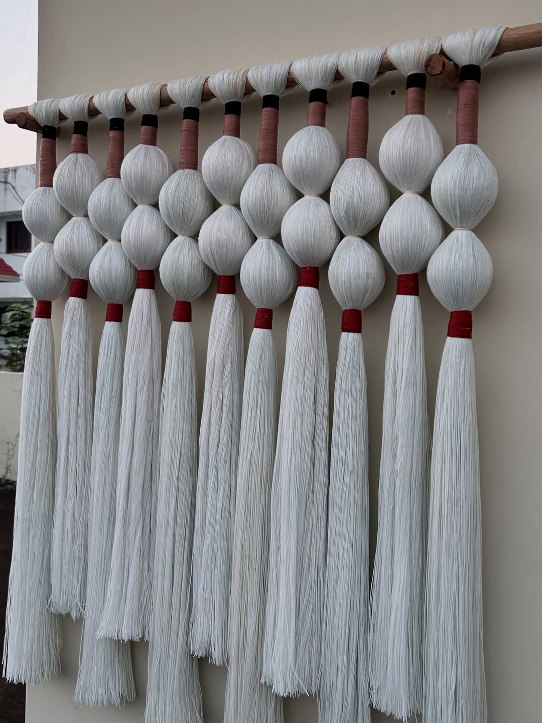 A luxurious handcrafted macrame wall hanging featuring elegant bead-style knots, rich maroon thread detailing, and long flowing tassels mounted on a natural wooden rod  turning threads into timeless wall art, because we can paint with threads.