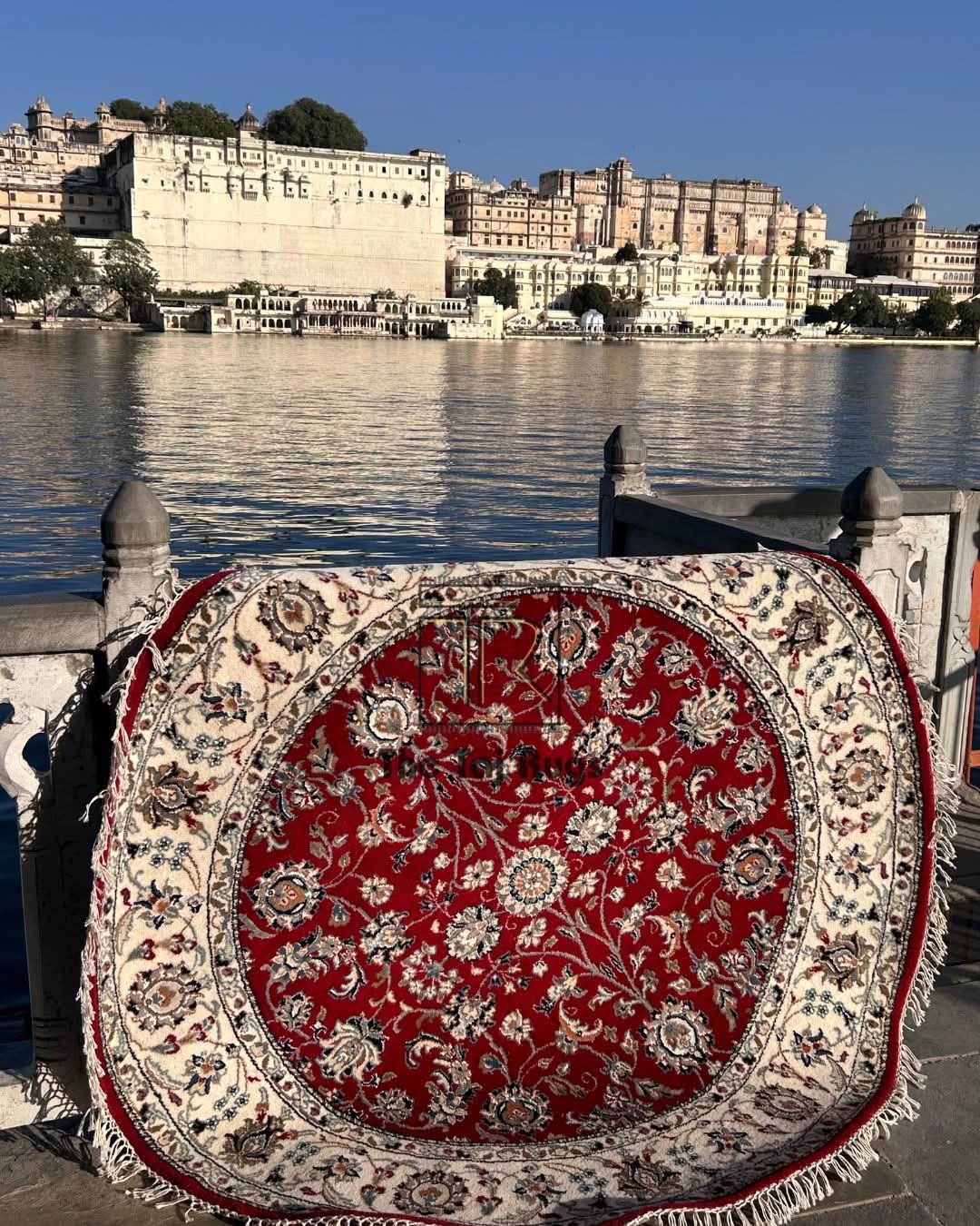 A luxurious round hand-knotted rug with intricate floral detailing, handcrafted to bring royal elegance into your interiors. Inspired by heritage, created by The Taj Rugs, we can paint with threads.