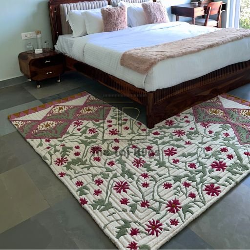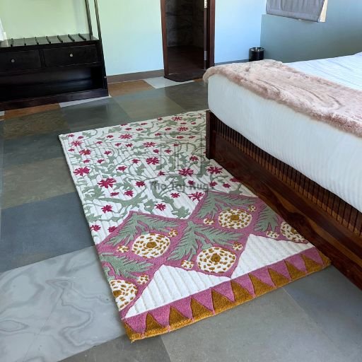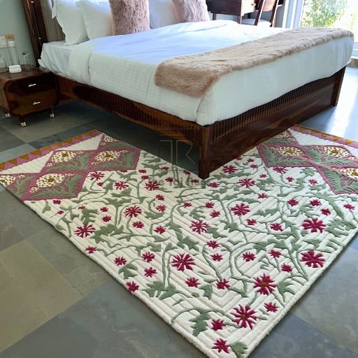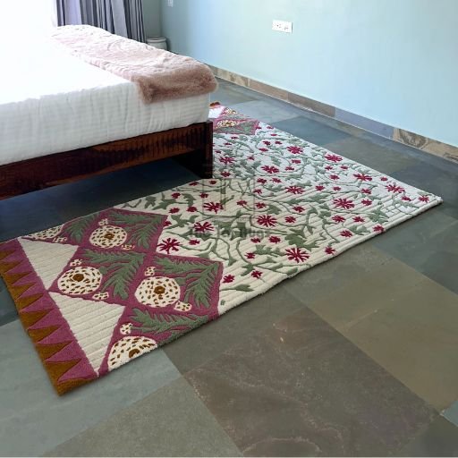 • A hand-tufted masterpiece inspired by Mughal mehrab arches and traditional Indian floral artistry.